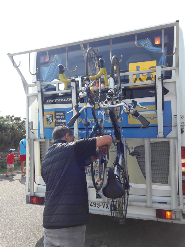 Pour permettre des déplacements intermodaux, le Département du Finistère a mis en place la possibilité de transporter des vélos sur ces lignes. Ce service se présente sous deux formes. Premièrement, il est possible de transporter toute l’année sur toutes les lignes des vélos en soute dans la limite de l’espace disponible. Deuxièmement, certains cars sont équipés pendant l’été de porte-vélo à l’arrière des cars pour permettre ainsi l’embarquement de 8 vélos. Ces cars circulent sur les lignes en lien avec les véloroutes et voies vertes. Ils contribuent ainsi à réduire le handicap de la véloroute inachevée à la Pointe du Raz et facilitent l’accès à l’Ouest Cornouaille depuis Quimper. La promotion de ce service et de la possibilité de réserver des places gagneraient à être renforcées. Ce service démarque le Finistère par rapport à d’autres destinations cyclables. Actuellement, l’embarquement des vélos est possible sur certaines courses desservant les arrêts de la Pointe du Raz, Audierne, Plozévet, Douarnenez, Saint-Guénolé, Léchiagat, Pont-l’Abbé et la gare de Quimper.