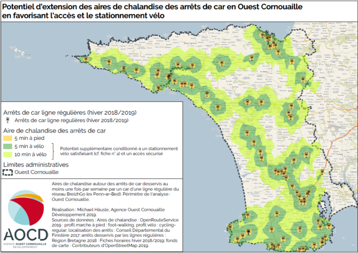 Les trajets intermodaux en Ouest Cornouaille combinent essentiellement des trajets à vélo avec des trajets en car ou en covoiturage. Or, seul 32 des 587 arrêts de car en Ouest Cornouaille (lignes régulières et lignes scolaires gérées par la Région Bretagne) sont dotés d’un stationnement vélo public à moins de 50 mètres de l’arrêt.