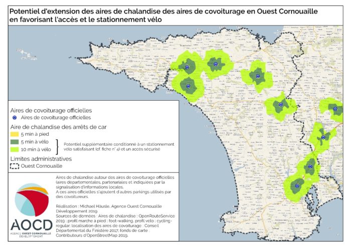 Comme le montre la carte ci-dessous, les aires d’influence à vélo autour des aires de covoiturages couvrent systématiquement l’intégralité ou une grande partie des agglomérations dans lesquelles elles sont implantées.